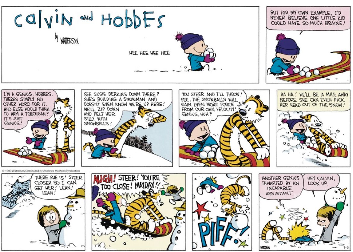 Calvin And Hobbes Sledding, The Benefit Of Calvin And Hobbes The Life Of An Idiot : Calvin and hobbes is a daily american comic strip created by cartoonist bill watterson that was syndicated from november 18, 1985 to december 31, 1995.. It would be fun to bring a different comic strip to life every winter. It's a magical world, hobbes, ol' buddy. In the wintertime, calvin and hobbes go down a nearby hill on their sled. The nature strips calvin and hobbesran in newspapers from 1985 to 1995. Here, in no particular order, is a selection of calvin and hobbes quotes that nail everything from the meaning of life to special underwear, like you know, hobbes, some days even my lucky rocket ship underpants don't help.